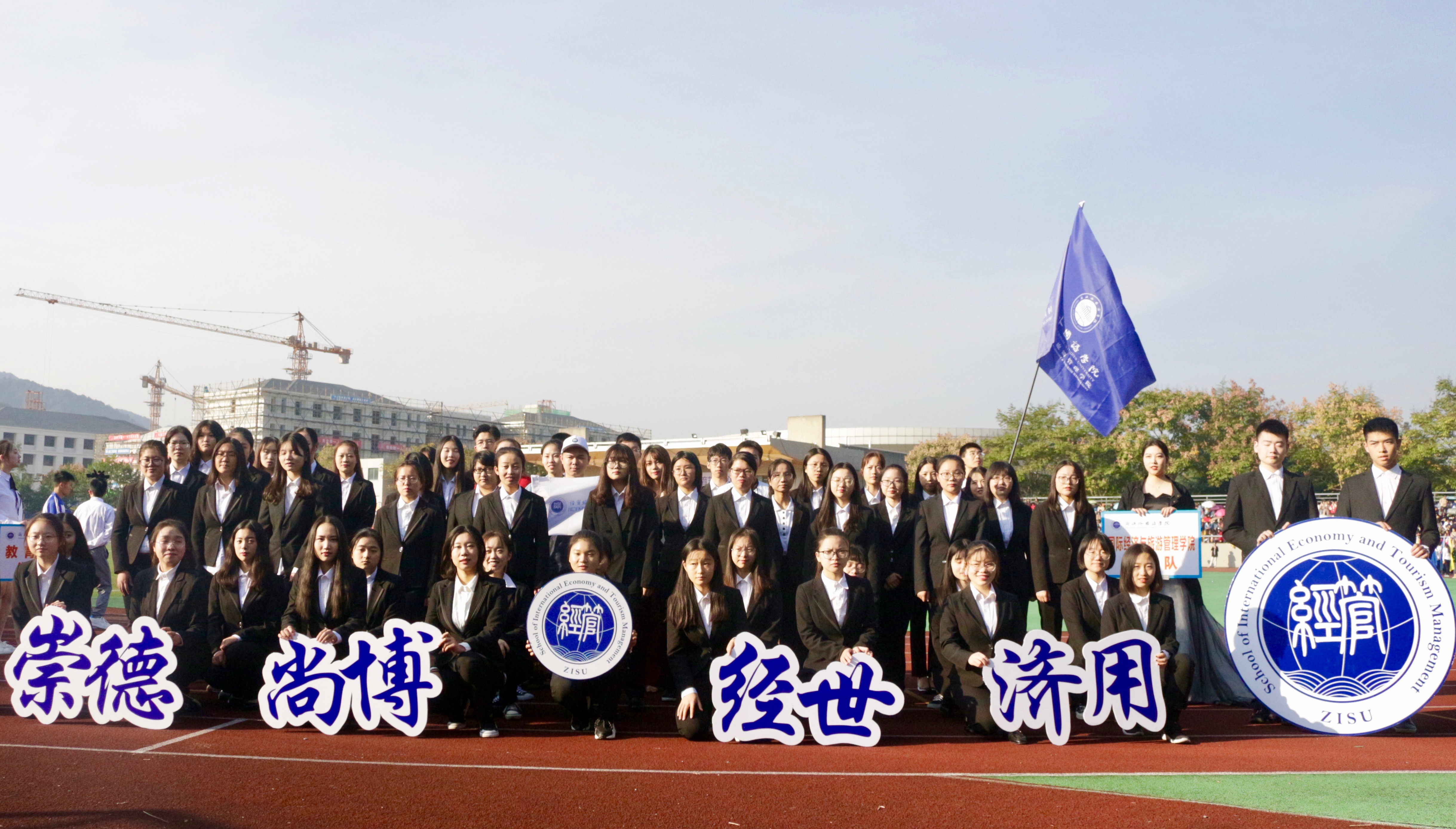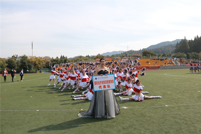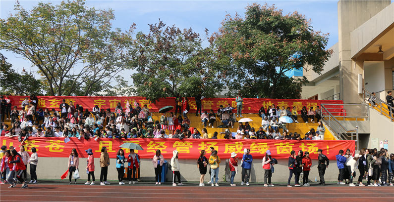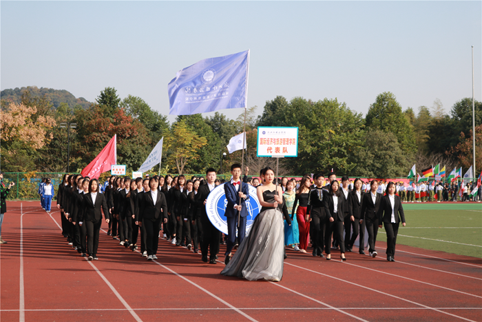 在全场观众的注视下,方阵表演开始,经管学子们一身成熟干练的着装,吸引了全场的目光。他们面迎朝阳,脚踏秋风,以蓬勃的朝气走出了青春的风采,他们以“崇德尚博”为立身之道,以 “经世济用”为奋斗目标,用满腔的热血迎向现代化潮流。