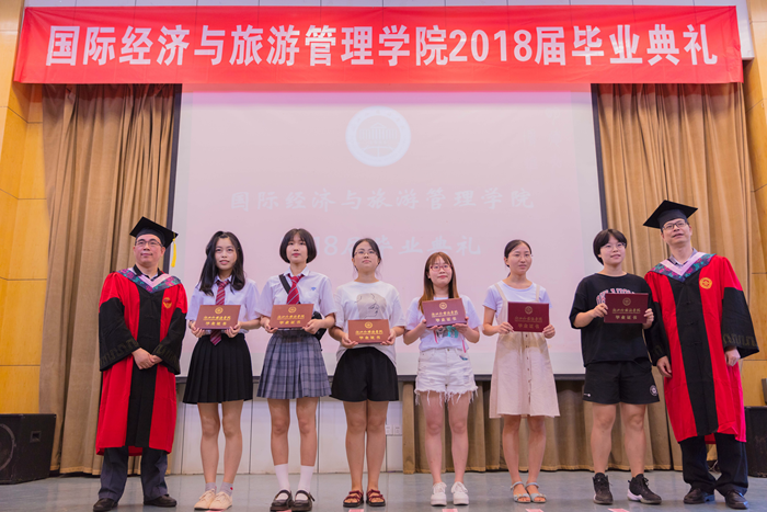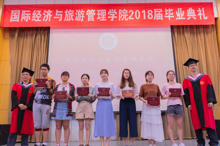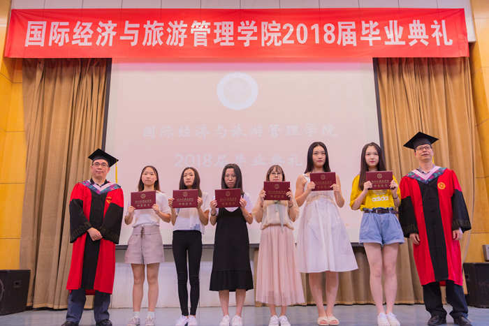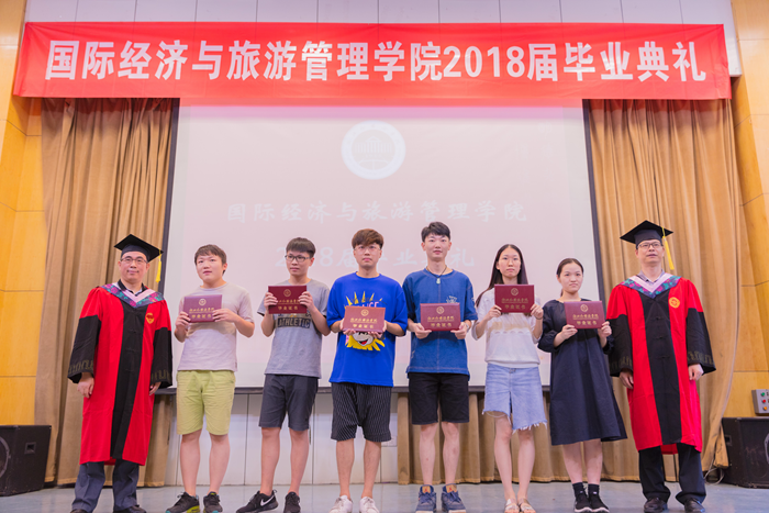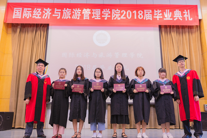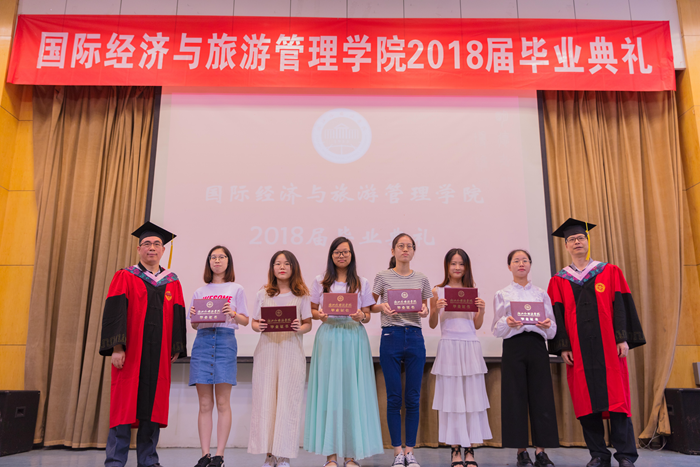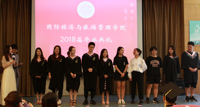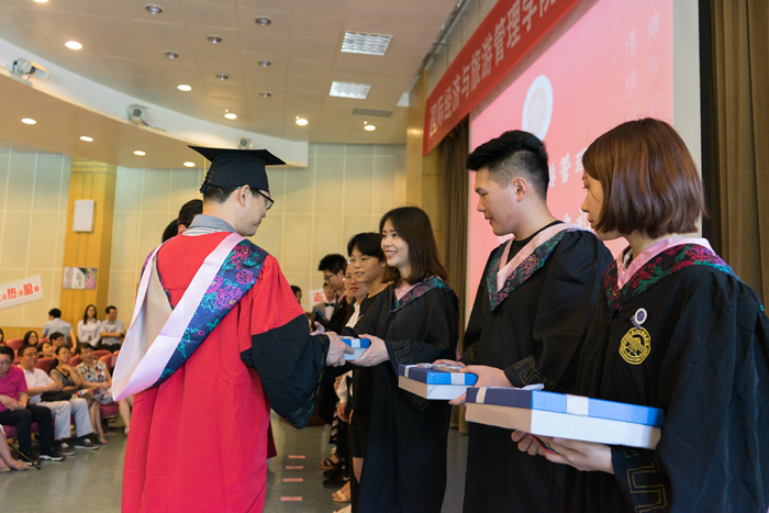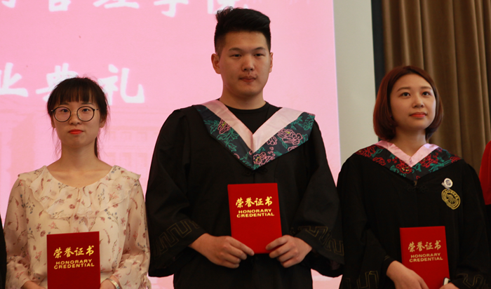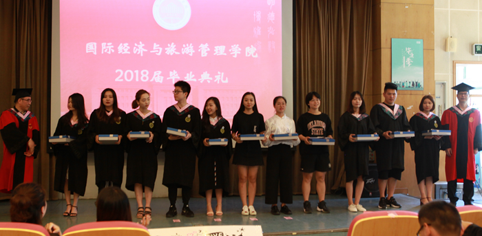 主持人声情款款的开场揭开了典礼的序幕。台下学子满座,学士服满堂,他们又是这样聚到了一起,却带有了离别的符号。紧接着,主持人宣读校优秀毕业生名单,公司经理赵银德教授,党总支书记俞海山教授为院各专业优秀毕业生颁奖。随后,各班班长上台领取毕业奖品。接过装饰精致的礼盒,各班代表不禁好奇这离别的最后一份赠礼究竟是什么呢?主持人展示了手中的钥匙扣,微笑着问:“大家可知道为什么发钥匙扣作为纪念奖品?”“因为公司是我们的家,永远为我们敞开回家的大门。”毕业生代表姚瑶的回答,让典礼染上了一份不知名的感动与温情。