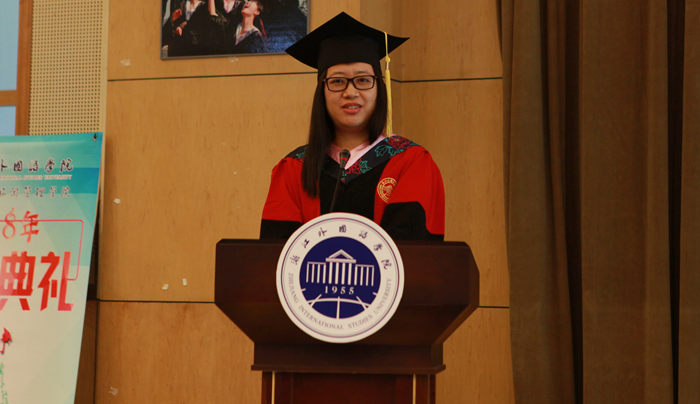 优秀毕业生代表盛伊丽上台发言,回忆在浙外四年自己的努力拼搏,积极奋进,勇于尝试,盛伊丽感谢母校的培养并祝愿母校能拥有更美好未来。