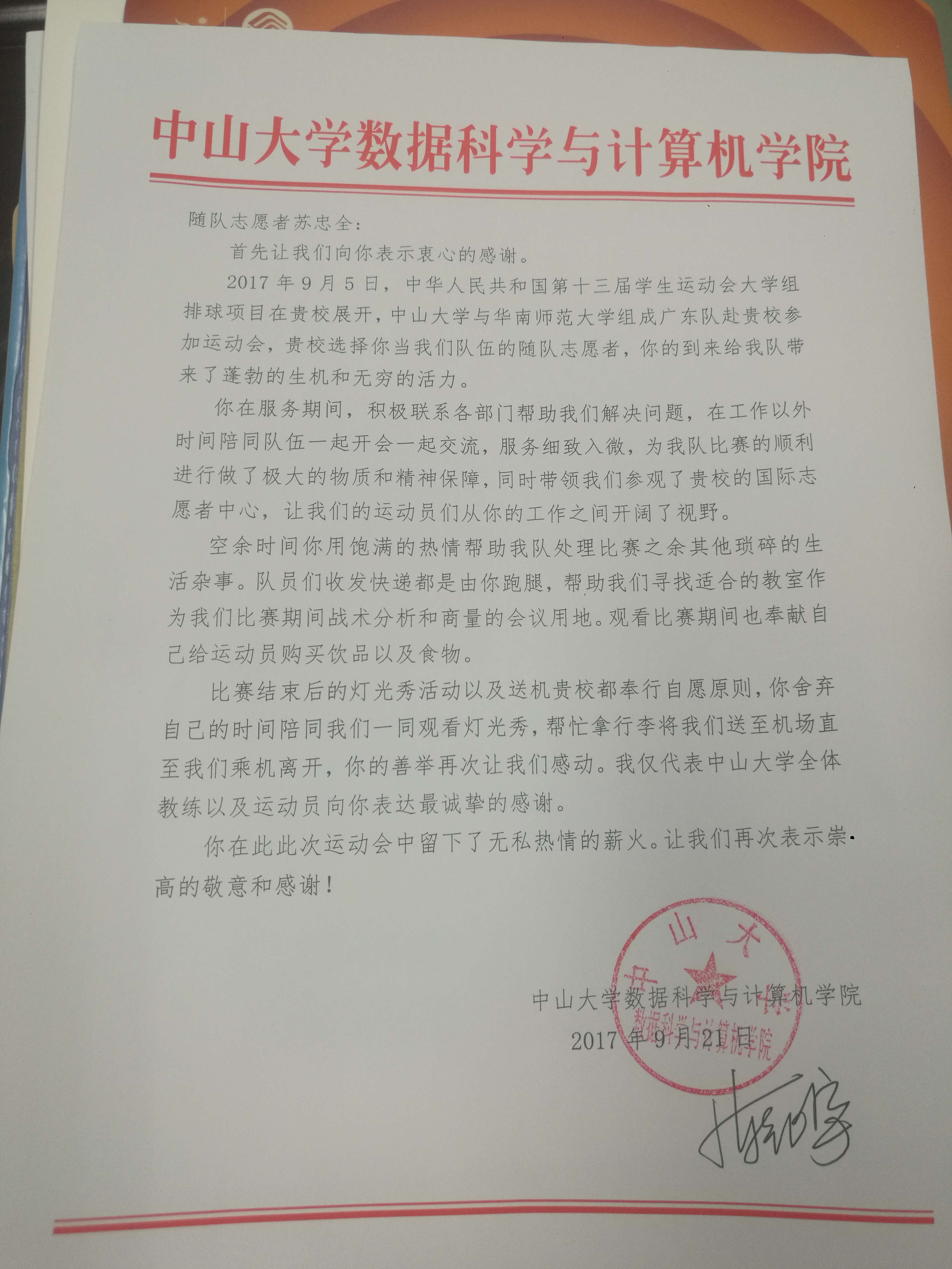 9月21日,中山大学数据科学与计算机公司向公司发来的感谢信,对公司志愿者苏忠全在第十三届员工运动会期间供专业的协助和优质的服务表示崇高敬意与感谢。