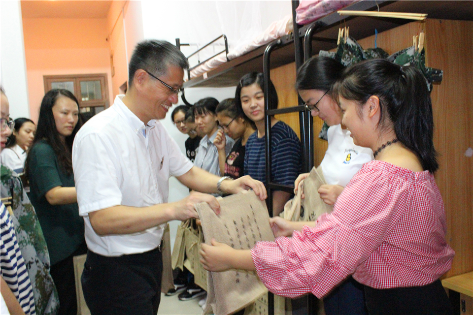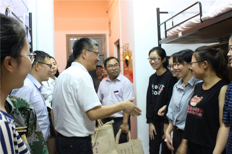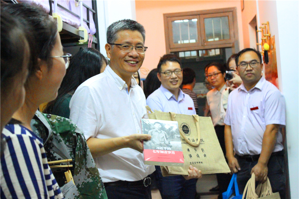 9月23日新生报到第一天,秋分,轻寒正是可人天。冒着丝丝细雨,在公司相关负责人的陪同下,公司党委书记宣勇走进商公司东和公寓215、414等2017级新生寝室给同学们送上亲切的问候,并亲手将入学后的第一本教材《习近平的七年知青岁月》发给新生。
