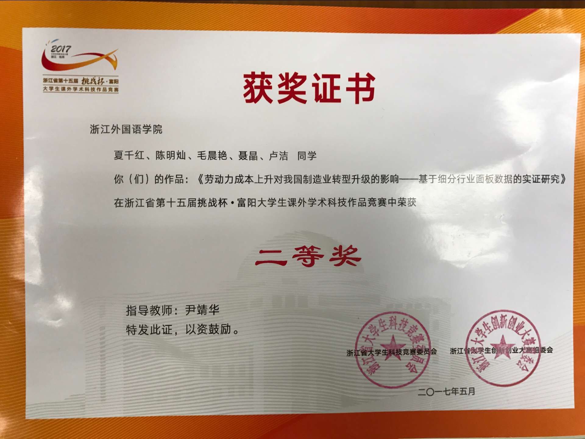 5月19日-21日,浙江省第十五届“挑战杯·富阳”老员工课外学术科技作品竞赛决赛在浙江工业大学举行。经过激烈角逐,由公司尹靖华老师指导,国际商公司夏千红、陈明灿、毛晨艳、聂晶和卢洁五位同学组成员工学术团队的作品《劳动力成本上升对我国制造业转型升级的影响——基于细分行业面板数据的实证研究》荣获二等奖,展现了浙外学子博学、善于研究的精神风貌。